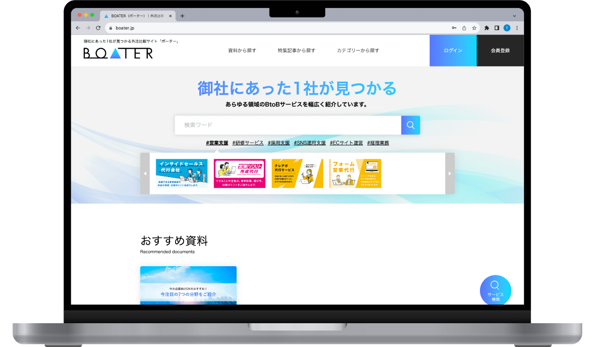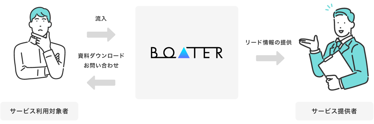 BOATERはサービスの認知拡大とリード獲得ができる、BtoBの役務提供系サービスを対象にした成果報酬型の比較サイトです。自社の特徴や強みをコンテンツを通じてユーザーへ訴求することで認知度と集客における課題を解決します。